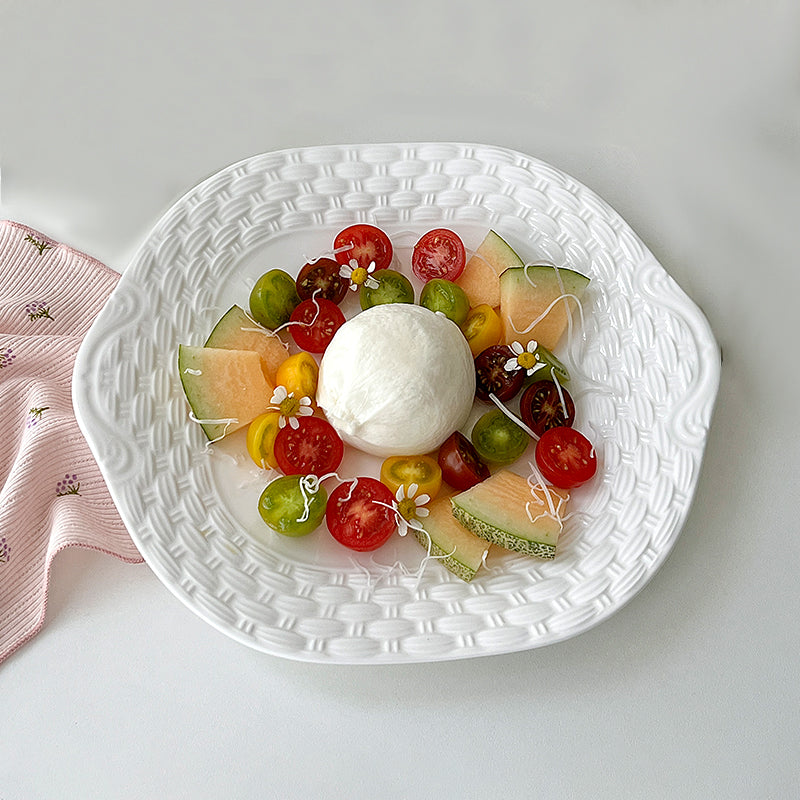 The pure white surface and textured relief awaken the senses, unveiling the romantic artistry of woven tableware.
