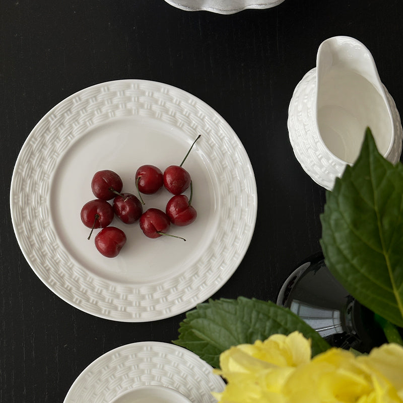 The pure white surface and textured relief awaken the senses, unveiling the romantic artistry of woven tableware.