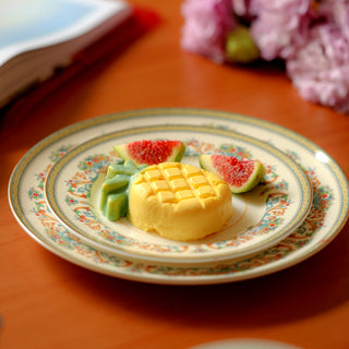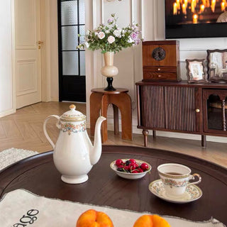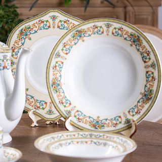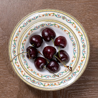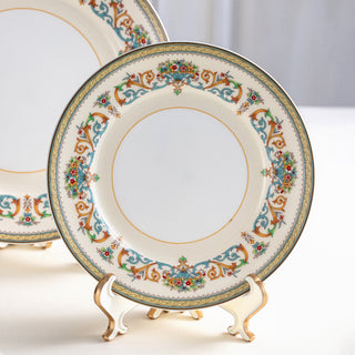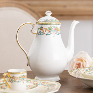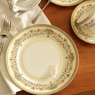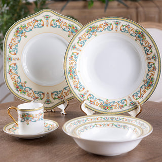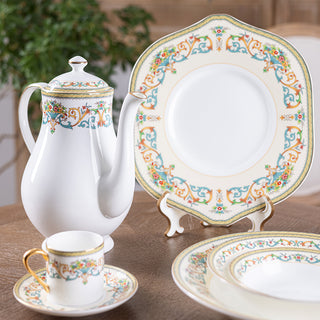 Created in 1974 for the British Royal Family, this white bone china with gilded rims features multicolored florals and golden scrolls. A blend of regal charm and exquisite craftsmanship, it stands as a symbol of luxury for European nobility and high society.