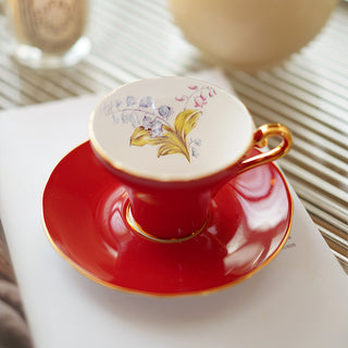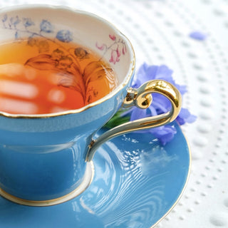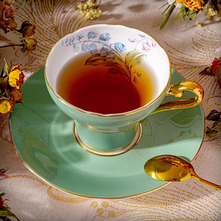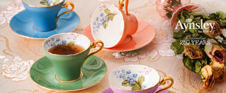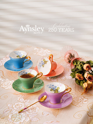 The Lily of the Valley Corset Cup, named for its shape that resembles a girl's slender and graceful corset with a wider opening at the top and a narrower one at the bottom, holds significant historical and collectible value. The cup features an elegant Morandi-colored glaze on its exterior, while the interior is adorned with delicate lilies of the valley in light blue and soft pink hues, blending exquisite artistic charm into home life. The finely crafted gold rims, hand-painted with smooth and rounded edges, boast a dazzling luster that catches the eye. This series was originally produced between 1934 and 1938 and has now been revived, making it one of Aynsley's iconic products.